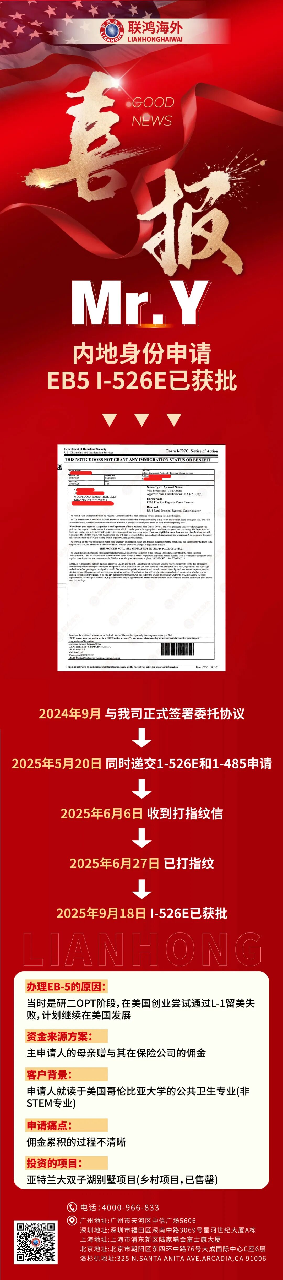【喜报】L-1创业留美失败,Y先生办理EB5获批I-526E留美成功