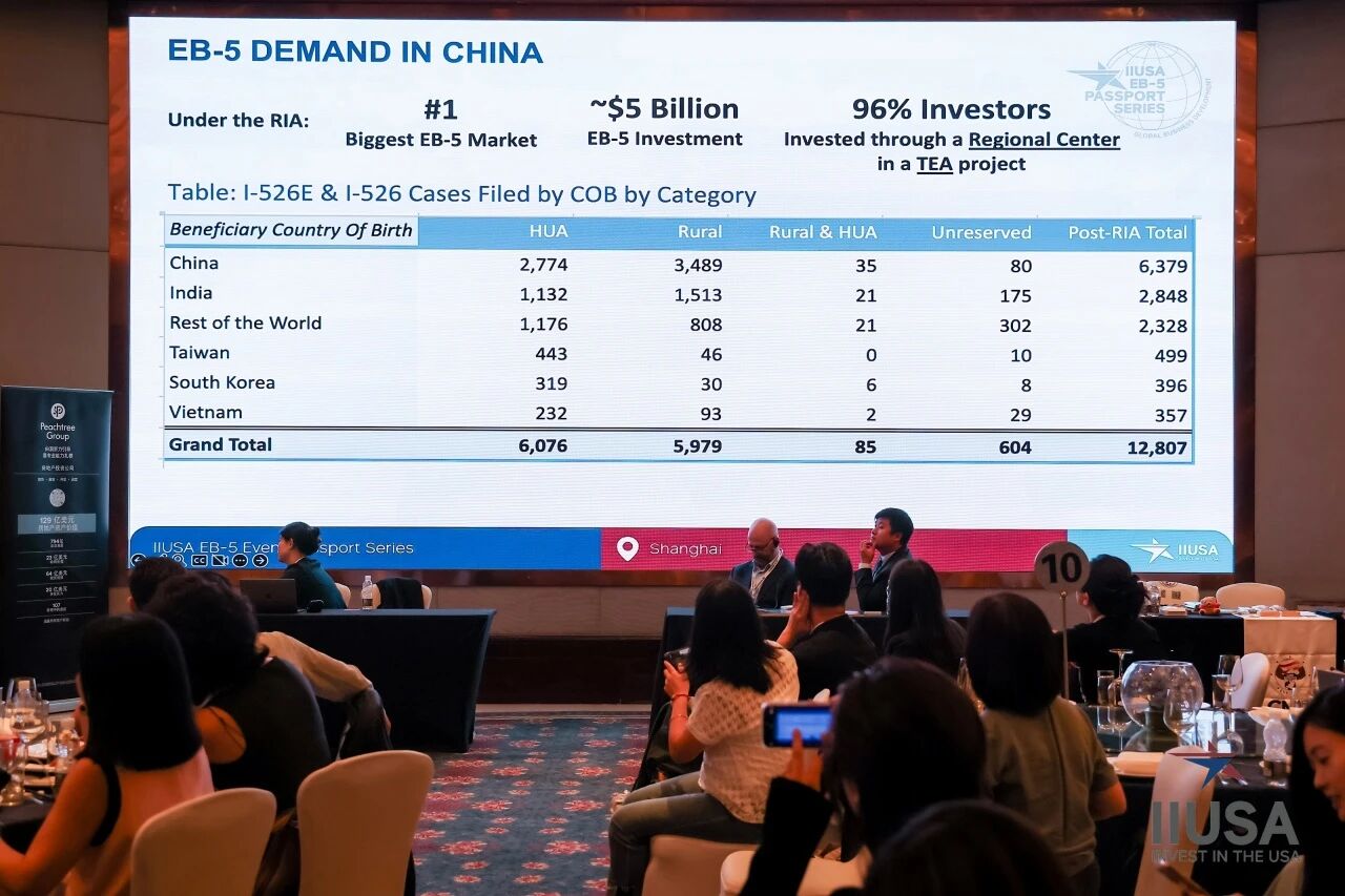 峰会披露的数据显示,中国是全球最大的 EB-5 市场:在《区域中心法案》(RIA)框架下,中国投资人的 EB-5 投资规模约 50 亿美元,且 96% 的中国投资人选择通过区域中心,在目标就业区(TEA)项目进行投资。从申请量来看,中国 “Post-RIA Total”(法案实施后总计)申请量达 6379 例,远超印度(2848 例)、世界其他地区(2328 例),足见中国市场对 EB-5 的强劲需求。