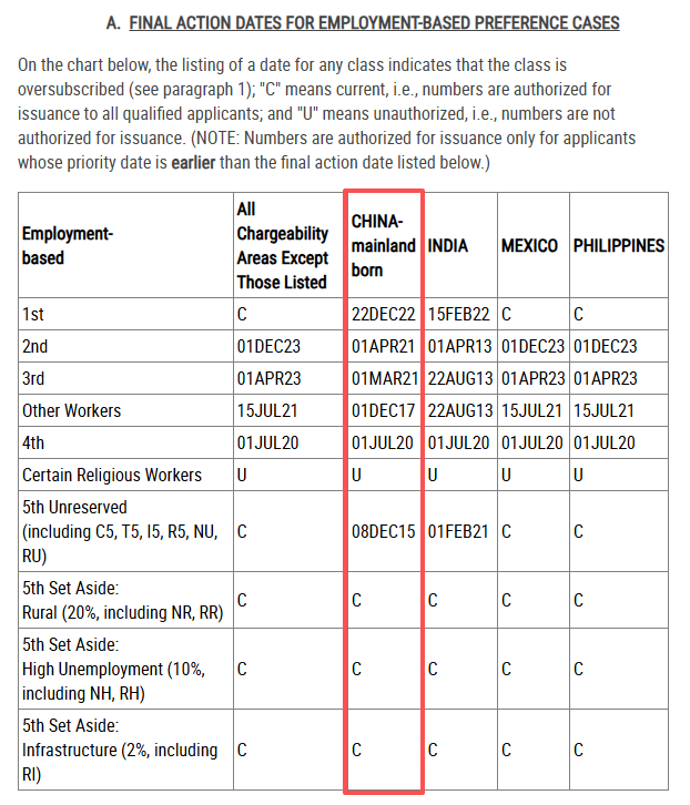 表A:移民签证的最后批准日期(Application Final Action Dates),又称移民排期;