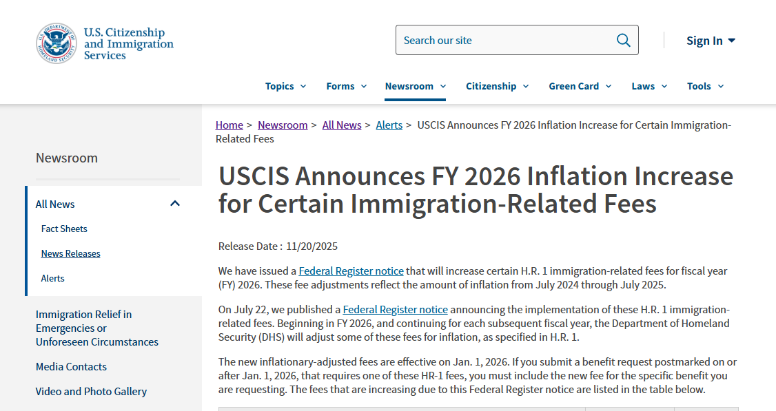 美国公民及移民服务局(USCIS)表示,修订后的收费标准适用于HR 1法案涵盖的特定移民福利。此次调整反映了2024年7月至2025年7月期间的通货膨胀情况。根据法律规定,国土安全部将在未来财政年度继续根据通货膨胀情况对这些费用进行年度调整。