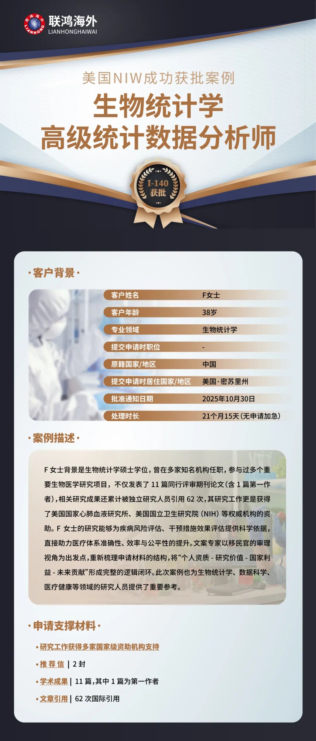 【喜报】生物数据分析师无评审经历+无加急在美获批NIW!