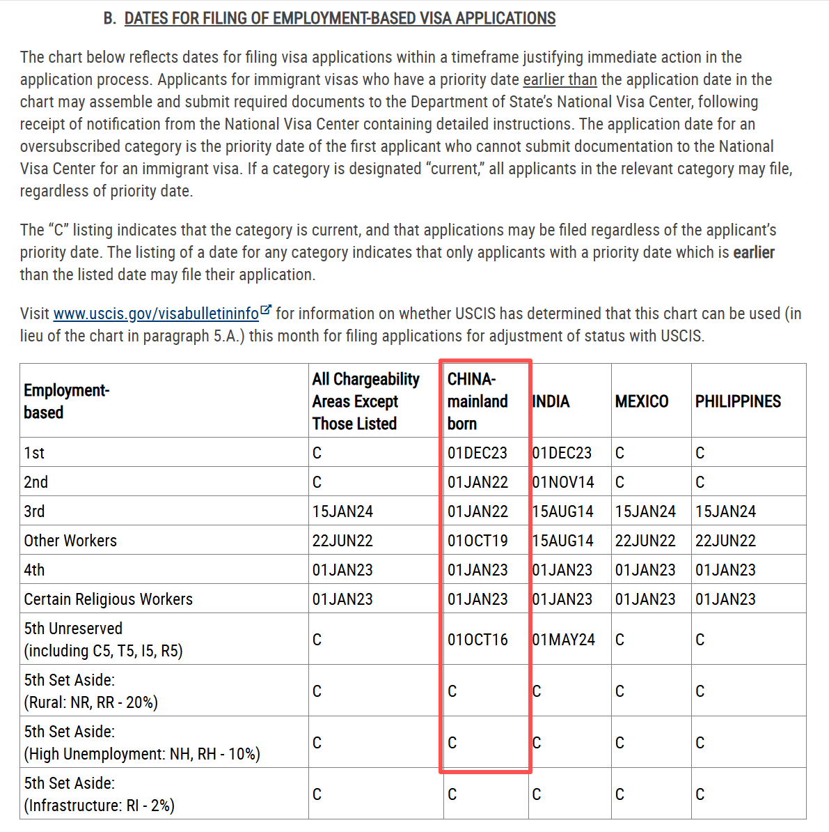 注:表A即移民签证可以被签发的最终审批日期如果申请人的优先日(Priority Dates)在表A的日期之前,就意味着他的排期到了,移民局或签证中心可对他的移民申请进行最终审核,并决定是否签发绿卡。如果表A排期未到,就是因为没有可以使用的移民签证名额,美国移民局和签证中心就不会对他的案子进行最终批准。