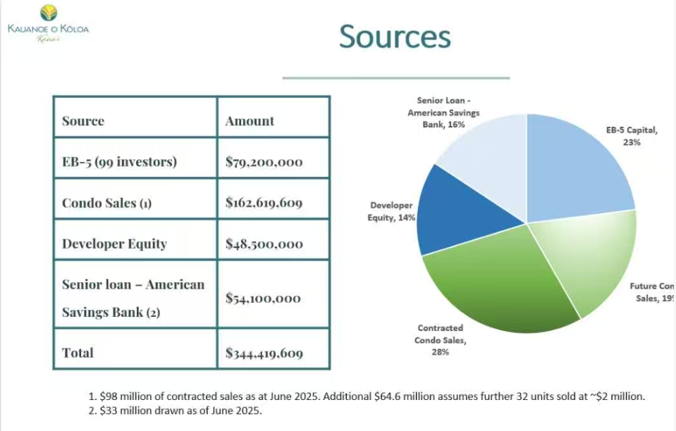 7.资金结构:项目总预算3.444亿美元,其中公寓第一期销售额1.6亿美元,占比约28%,EB5资金为7920万美元,占比约23%,开发商土地权益为4850万,占比14%;高级贷款约5410万,占比16%。