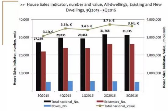 2016年第三季度,葡萄牙房产交易数量为31535起,其中26341起为现房,相比同期达到了历史最高值。房产交易总额超过36亿欧元,与去年同期相比增长了17.6%。