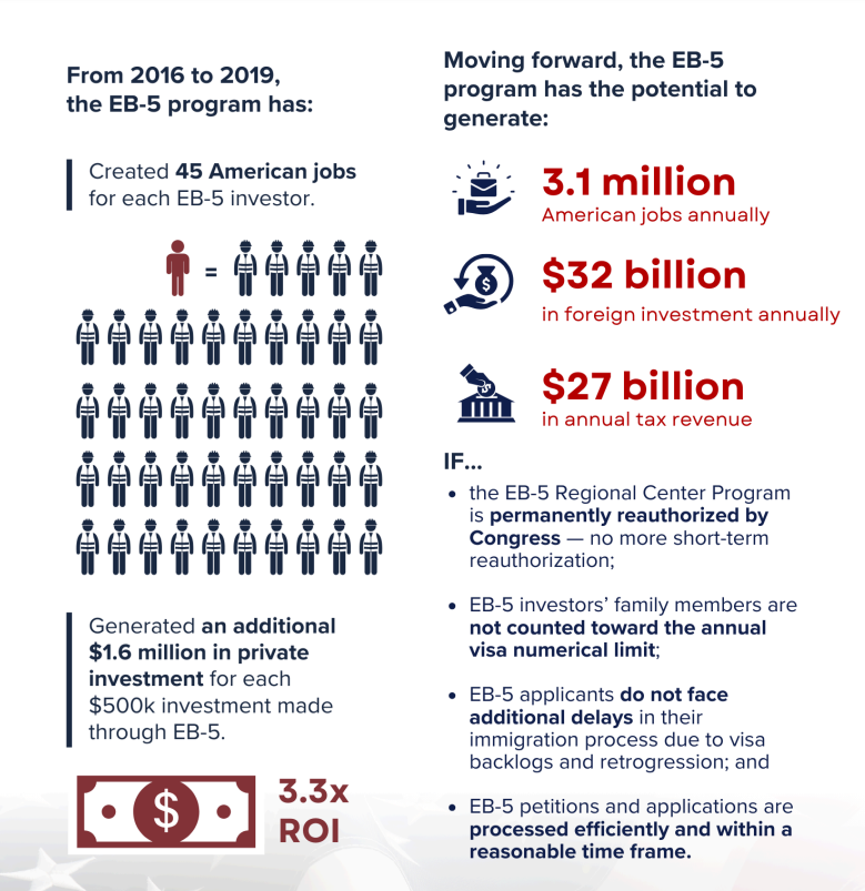 第四经济组织(Fourth Economy)对2016-2019 年EB-5投资开展的独立分析显示,报告显示,每位EB-5投资者平均为美国创造45个就业岗位,并带动160万美元的额外私人投资。仅在 2016至2019年间,该计划就推动了总计752亿美元的投资,支持170万个就业岗位,并贡献了184亿美元GDP。