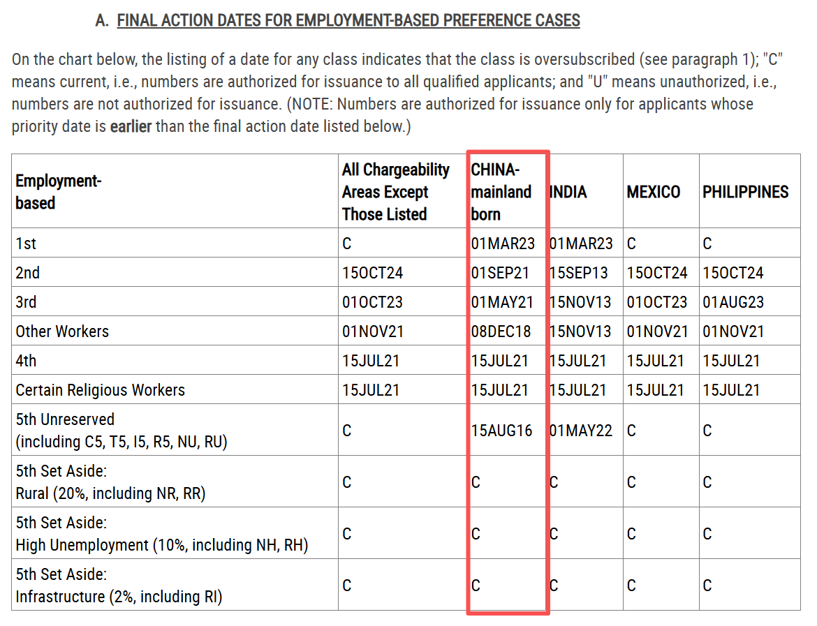 注:表A即移民签证可以被签发的最终审批日期如果申请人的优先日(Priority Dates)在表A的日期之前,就意味着他的排期到了,移民局或签证中心可对他的移民申请进行最终审核,并决定是否签发绿卡。如果表A排期未到,就是因为没有可以使用的移民签证名额,美国移民局和签证中心就不会对他的案子进行最终批准。