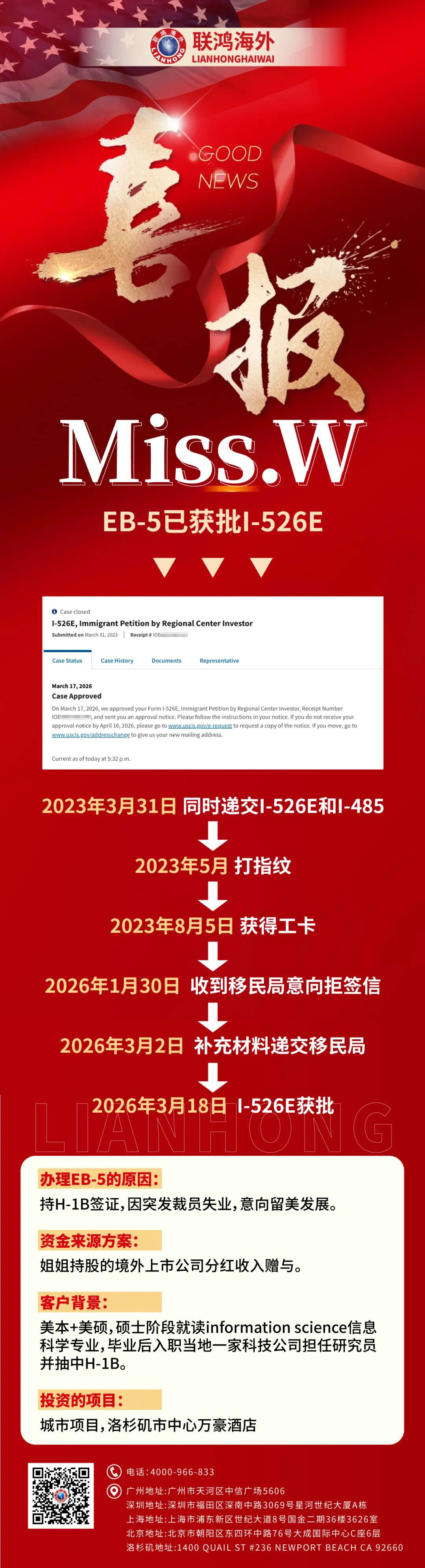 【喜报】境外上市公司分红收入赠予,W同学办理EB5获批I-526E